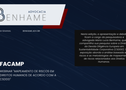Nesta edição, a apresentação e debate ficam a cargo da pesquisadora e advogada Maria Lucia Benhame, que compartilha sua pesquisa sobre a Diretiva da Devida Diligência Europeia em Sustentabilidade Corporativa (CSDDD).