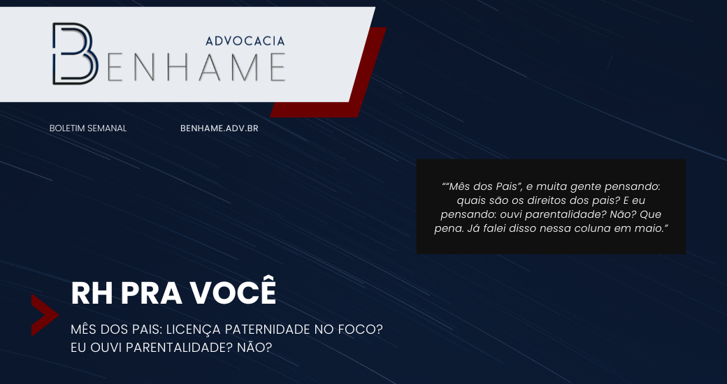 “Mês dos Pais”, e muita gente pensando: quais são os direitos dos pais? E eu pensando: ouvi parentalidade? Não? Que pena. Já falei disso nessa coluna em maio.