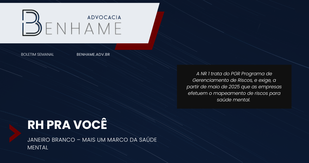 A NR 1 trata do PGR Programa de Gerenciamento de Riscos, e exige, a partir de maio de 2025 que as empresas efetuem o mapeamento de riscos para saúde mental. Ou seja, a empresa deverá mapear se há riscos em suas atividades, forma de gestão e outros, que possam prejudicar a saúde mental dos empregados, e a partir daí fazer um plano de extinção, mitigação e reparação de eventuais danos.[1]