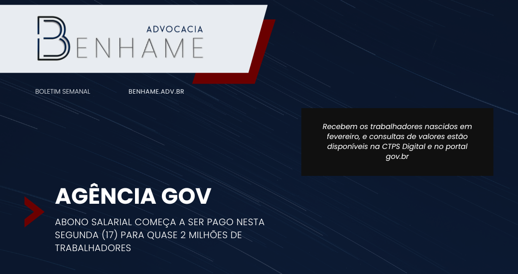 O Ministério do Trabalho e Emprego (MTE) começa a pagar hoje (17/3) o segundo grupo de trabalhadores nascidos em fevereiro com direito ao abono salarial. Serão pagos abonos a 1.976.258 trabalhadores com direito a receber o benefício, com a liberação de R$ 2.345.419.265 bilhões. São elegíveis para esse grupo os trabalhadores nascidos em fevereiro, e as consultas de valores estão disponíveis na CTPS Digital e no portal http://gov.br
