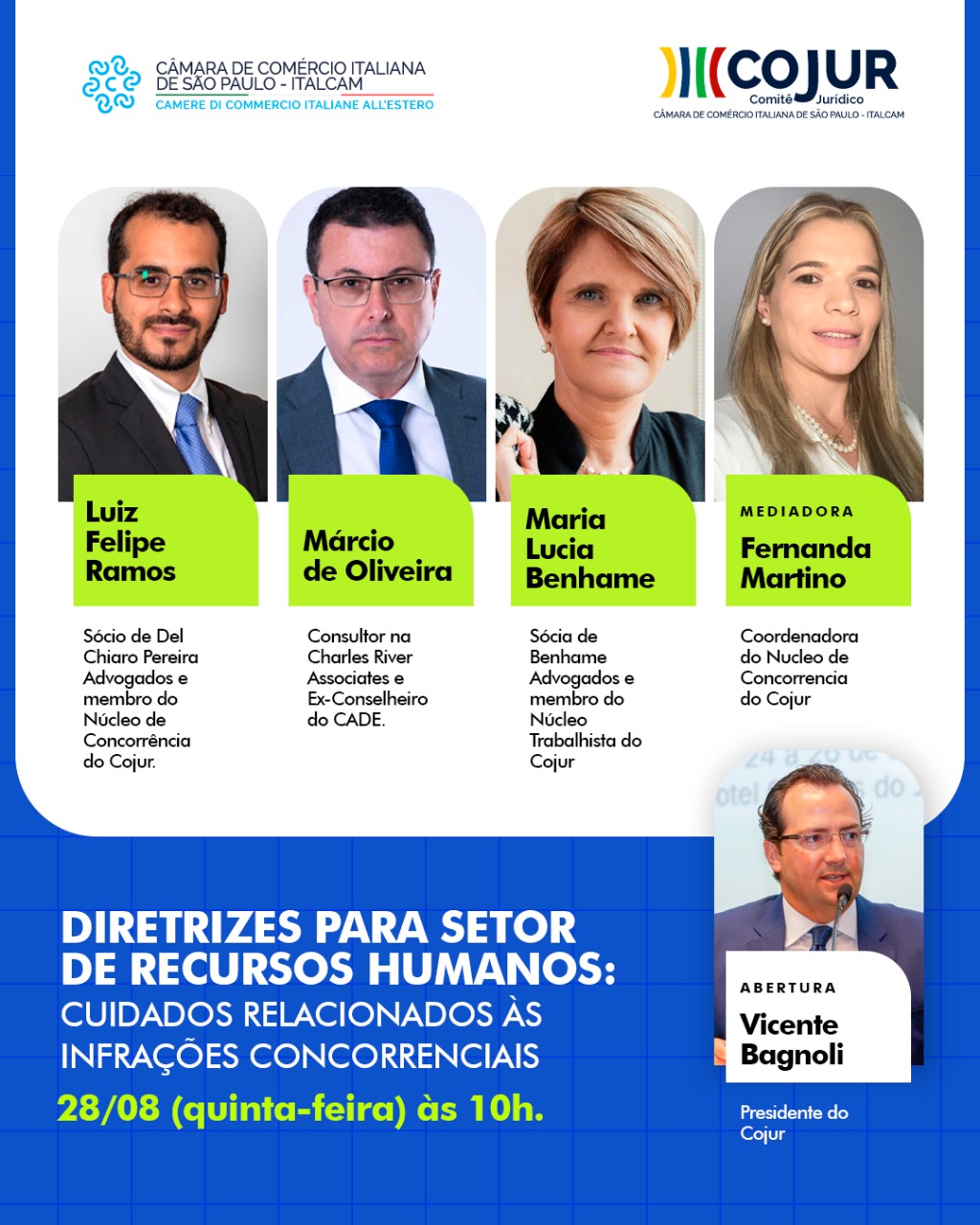 Debatedores: – Luiz Felipe Ramos: Sócio de Del Chiaro Pereira Advogados e membro do Núcleo de Concorrência do Cojur.