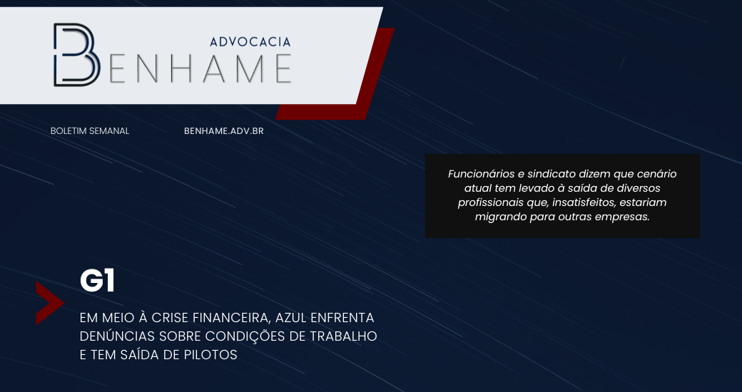 “A Azul informa que está em acordo com as regulamentações vigentes e nega qualquer irregularidade ou piora nas condições de trabalho de seus aeronautas. A empresa ressalta que mantém diálogo com o sindicato representante da categoria.
