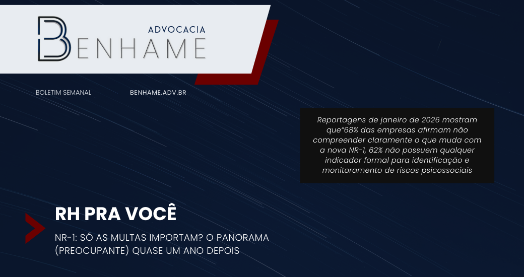 Reportagens de janeiro de 2026 mostram que“68% das empresas afirmam não compreender claramente o que muda com a nova NR-1, 62% não possuem qualquer indicador formal para identificação e monitoramento de riscos psicossociais, um dos pontos centrais da atualização da norma, e 58% admitem que só reagiriam a problemas de saúde mental após afastamentos, denúncias formais ou ações judiciais, evidenciando um modelo ainda predominantemente reativo”.